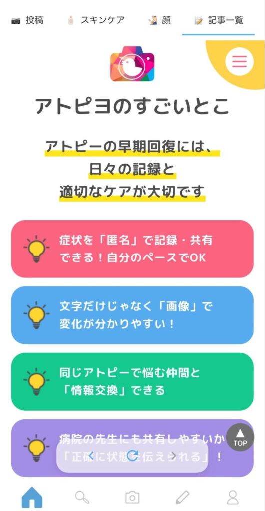 アトピヨのアプリでは、みんなが実際に試したケアや工夫が数多く投稿されています。「これでかゆみが落ち着いた」「この方法が自分に合っていた」など、リアルな体験からヒントが見つかるかもしれません。ぜひ参考にしてみてください。