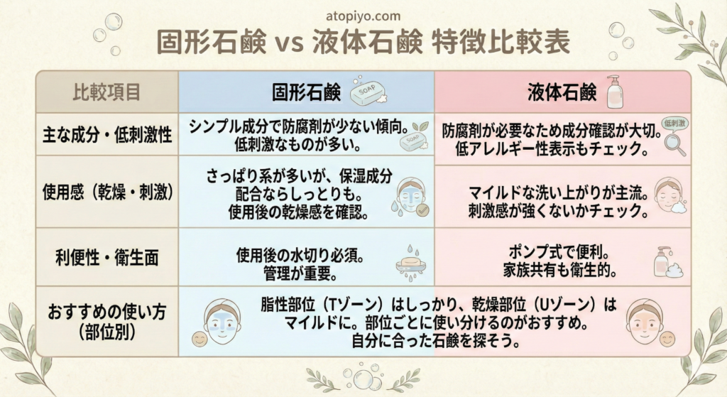 固形石鹸と液体石鹸、どちらがアトピー肌に適しているのでしょうか?