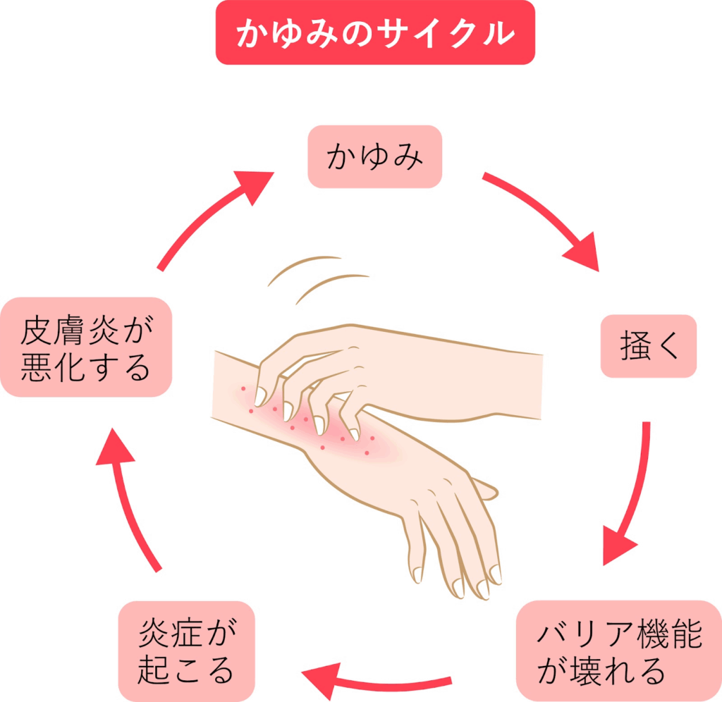 アトピー性皮膚炎では、強いかゆみから掻いてしまうことで皮膚のバリア機能が壊れ、そこから炎症が悪化します。その結果、かゆみがさらに増し、また掻いてしまうという悪循環に陥ります。乾燥も進行し、症状をさらに悪化させます。