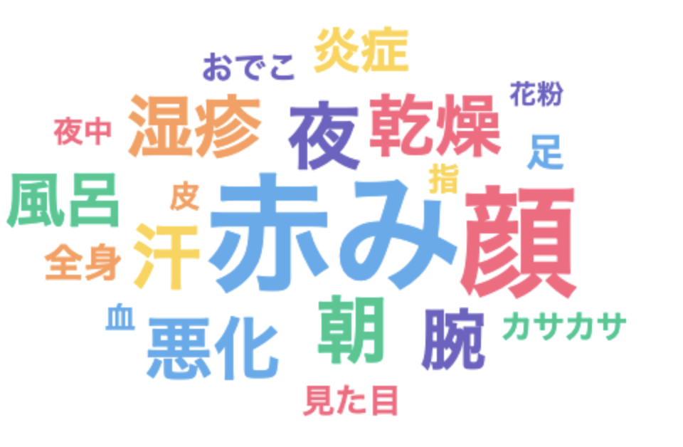 なかでも「痒み」は、アトピーの代表的な症状で、ユーザーの投稿に含まれる悩みワードの中で頻出しています。アトピー肌の症状改善に向けて、正しいケアと継続が重要です。